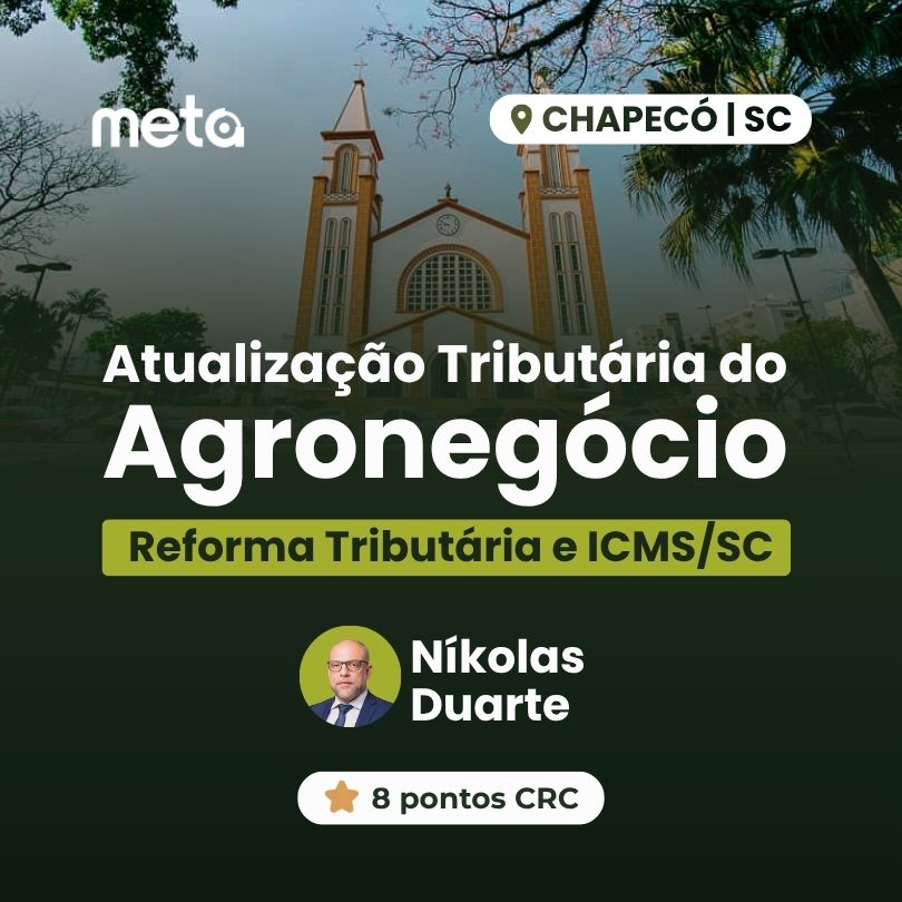 Você compreenderá os impactos da Reforma Tributária no agronegócio, desenvolvendo uma visão estratégica para mitigar riscos e conduzir uma transição segura e eficiente para o novo modelo de tributação. Além disso vamos analisar as recentes atualizações no ICMS/SC que ordenam os benefícios fiscais para o setor, garantindo que você esteja pronto para aplicar as alterações trazidas pelas Leis 19.395/25 e 19.729/26.